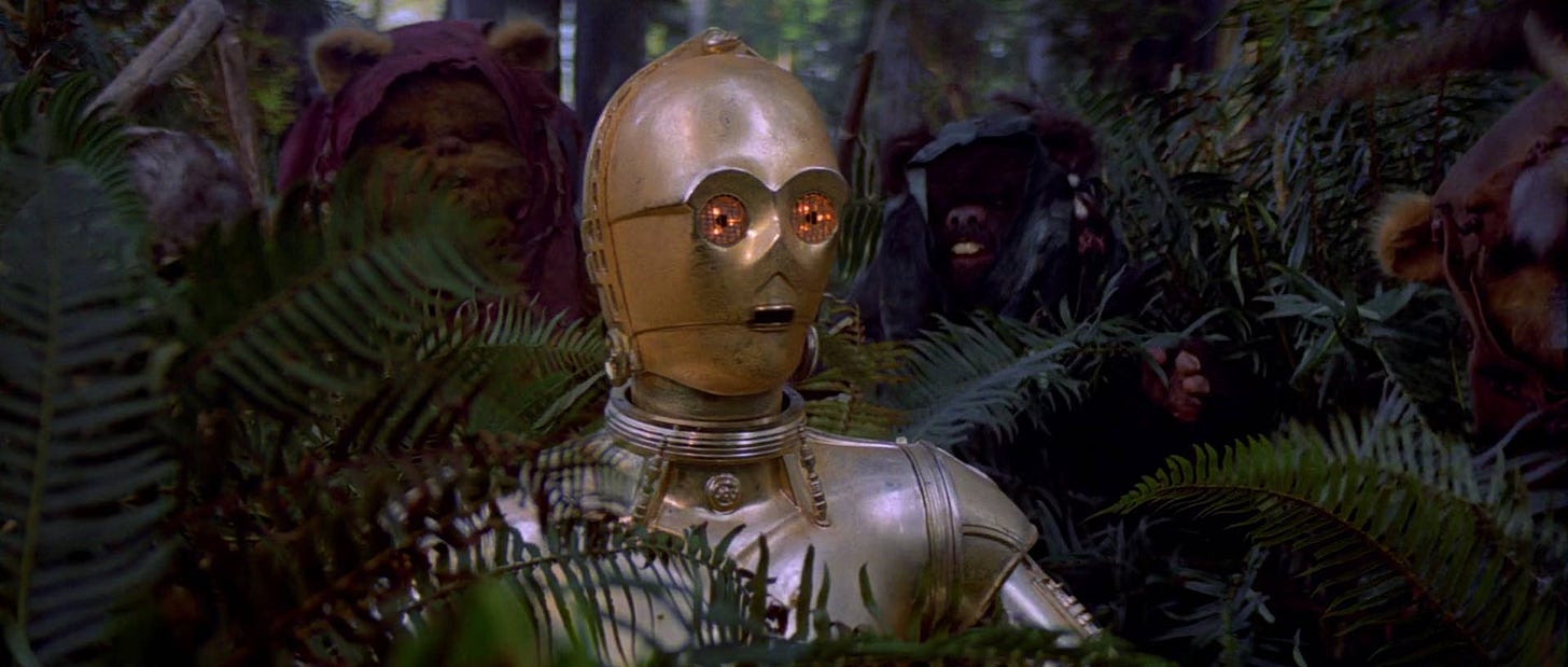 In all three episodes of the original trilogy, C-3PO has a run-in with a group of small aliens. In each case, these diminutive aliens are primitive, animalistic, and unruly, in sharp contrast to the fastidious, intellectual, etiquette-oriented “protocol droid” C-3PO.