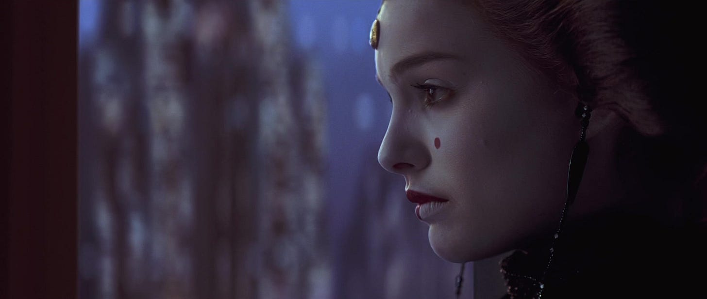 In The Phantom Menace, Padmé Amidala watches the sun set over the Coruscant skyline while ruminating on the possible deaths of her people, the Naboo. (”Yousa thinking yousa people gonna die?” asks Jar-Jar Binks.) Because the Senate will not act in a timely manner to save Naboo from the Trade Federation, Padmé decides to defy the instructions of Senator Palpatine and take matters into her own hands. She leaves in a ship to save her people by mounting a military campaign in partnership with the warlike Gungans, abandoning her pacifist ideals and contradicting her earlier statement, “I will not condone a course of action that will lead my people to war.”