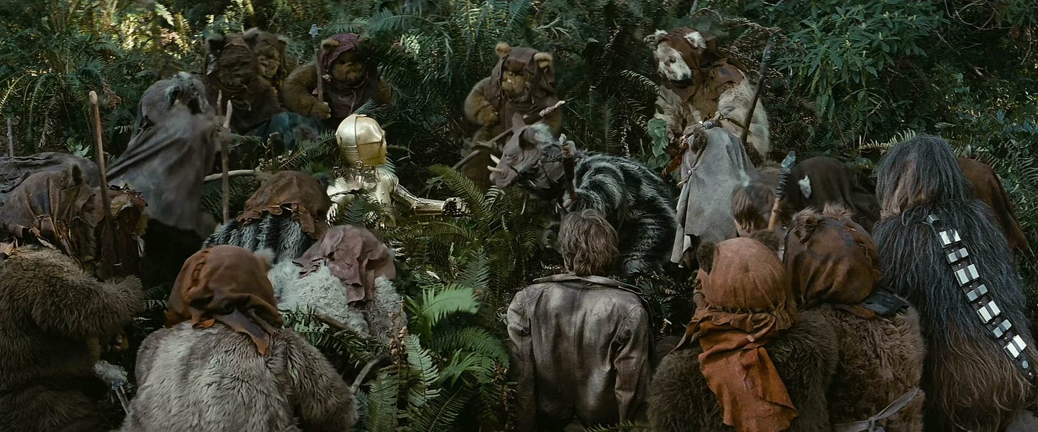 In Return of the Jedi, Luke Skywalker and his friends are trapped by the Ewoks, who mistake C-3PO for a god. Han Solo impatiently demands, "Why don't you use your divine influence and get us out of this?" However, C-3PO is reluctant: "It's against my programming to impersonate a deity." When the Ewoks are about to roast the heroes as part of a banquet held to worship C-3PO, despite C-3PO's objections, Luke intervenes and uses the Force to levitate C-3PO in the air as a display of his "magic." Awed into obedience, the Ewoks do as their god demands and set the heroes free.