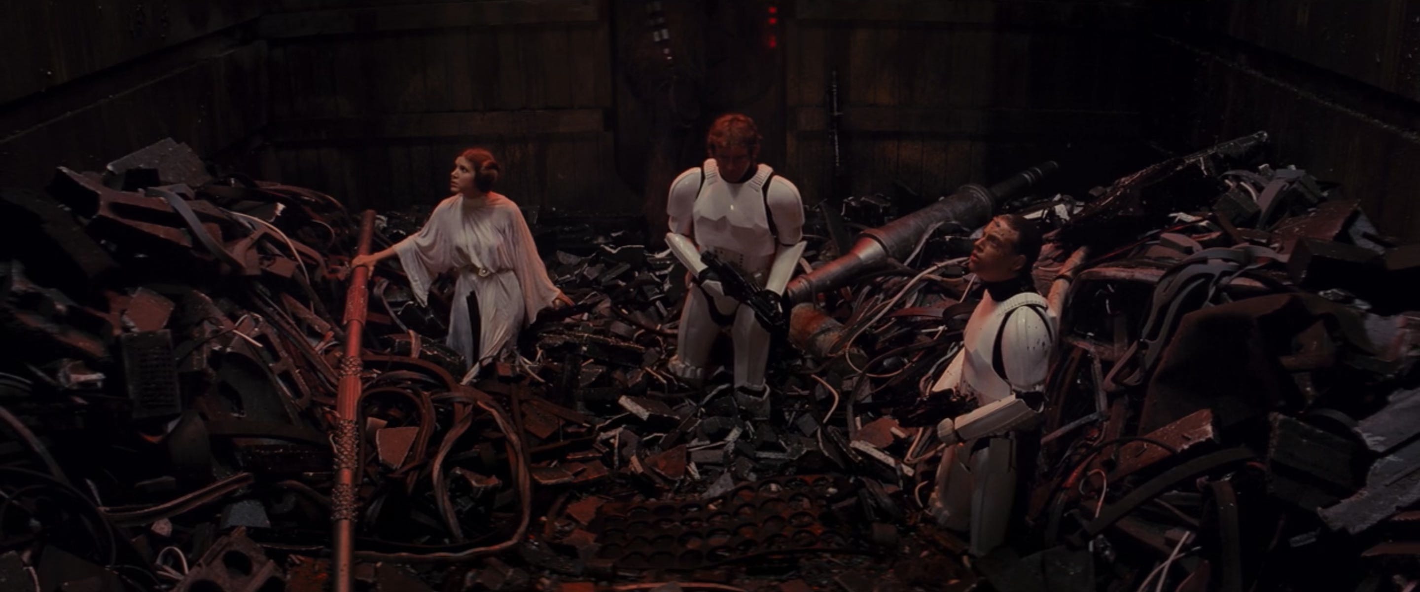 In A New Hope, Luke Skywalker and Han Solo rescue Princess Leia Organa from her prison cell on the Death Star, but find themselves cornered in a hallway by Stormtroopers. Leia has the idea to escape by taking a garbage chute down into a trash compactor.