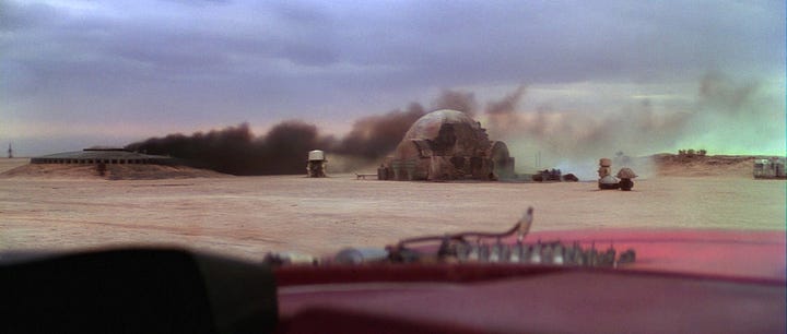 When Luke returns to the Lars homestead at the end of A New Hope‘s first act, he discovers that it has been burned in his absence and sees his aunt and uncle’s dead bodies in its ruins. This scene pays overt homage to a similar moment at the end of The Searchers‘ first act, when John Wayne’s Ethan Edwards returns to his family’s homestead, discovers that it has been burned in his absence, and finds his relatives’ dead bodies in its ruins.