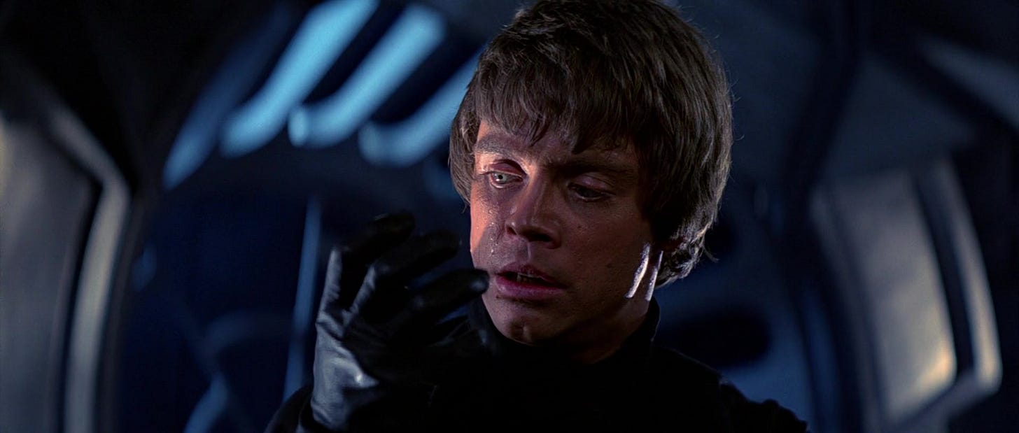 Ultimately, when Luke angrily cuts off Vader’s right hand and sees that it is a cyborg hand, like his, he recognizes that he is in danger of becoming like his father. Remembering that, per Yoda, “A Jedi uses the Force for knowledge and defense, never for attack,” Luke masters his aggression and uses his left hand – his light, natural hand – to throw away his weapon, declaring, “I am a Jedi, like my father before me.”