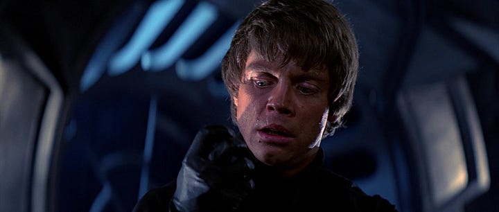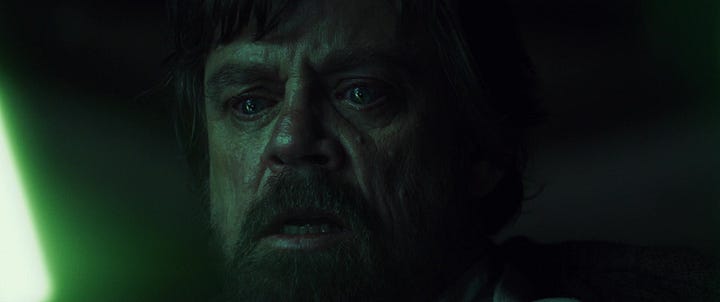 In The Last Jedi, Luke explains to Rey that when he was training his nephew Ben Solo, he sensed a future in which Ben turned to the dark side: “He would bring destruction and pain and death and the end of everything I love because of what he would become, and for the briefest moment of pure instinct, I thought I could stop it.” As in Return of the Jedi, when Luke’s loved ones are threatened, he instinctively reacts out of aggression. Using his cyborg hand, he ignites his lightsaber to attack Ben, only to come to himself a moment later, looking at the cyborg hand and recognizing that he has briefly become like his father, who killed Jedi trainees to try and stop his visions of his wife’s future death from coming to pass.